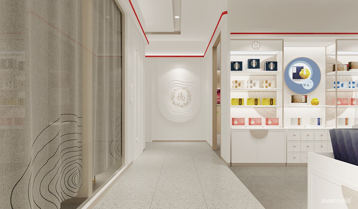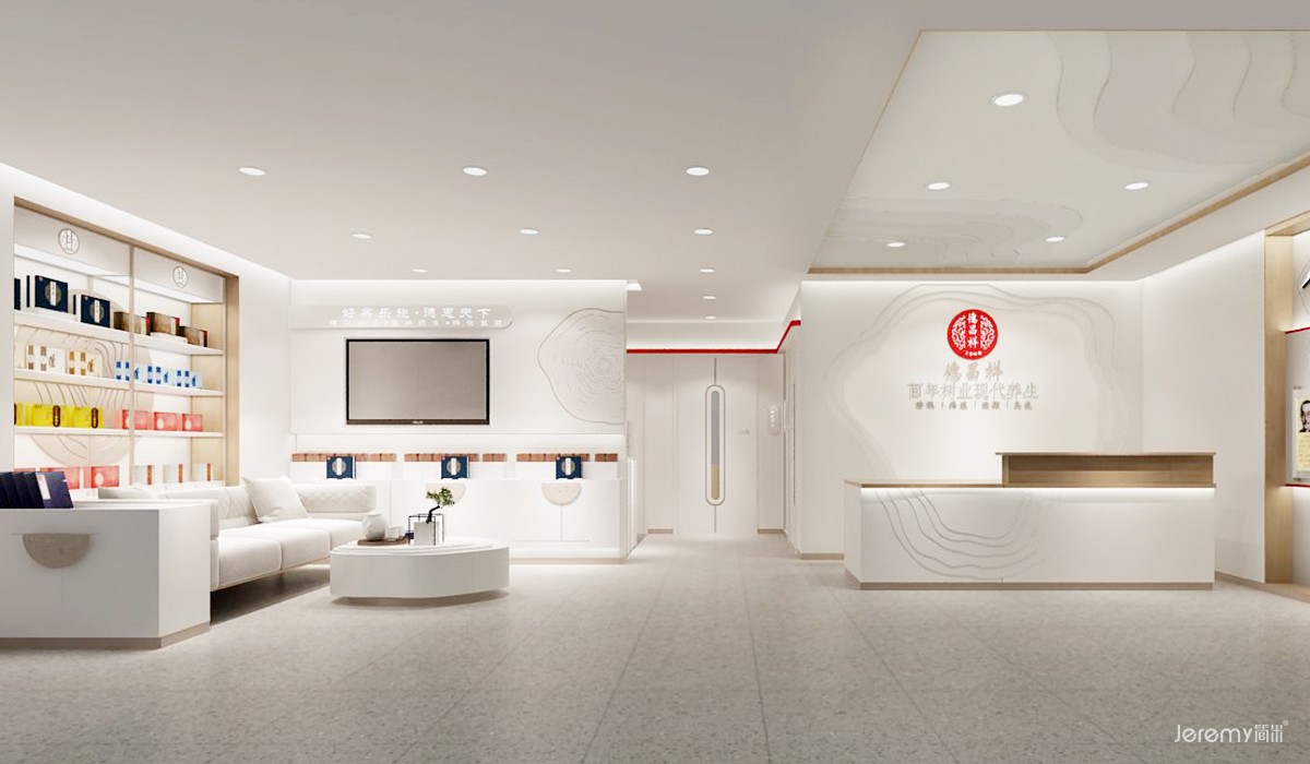 秉承品牌“百年树业 现代养生”理念,终端以呈现现代简约中国风为设计核心思维。运用品牌LOGO元素进行装饰,以增强识别,以奶白色为主基调,整体材质以及色彩搭配温馨时尚兼顾 ,通过主色与辅助色的组合运用,突出德昌祥品牌空间的氛围特征。让空间环境符合“养疗健康服务”现代养生行业的轻松舒适,又能体现德昌祥独特的历史文化与现代时尚感的结合氛围。客体验更亲和舒适,细节处采用新中式风格隔断等点缀,营造空间现代国风氛围。